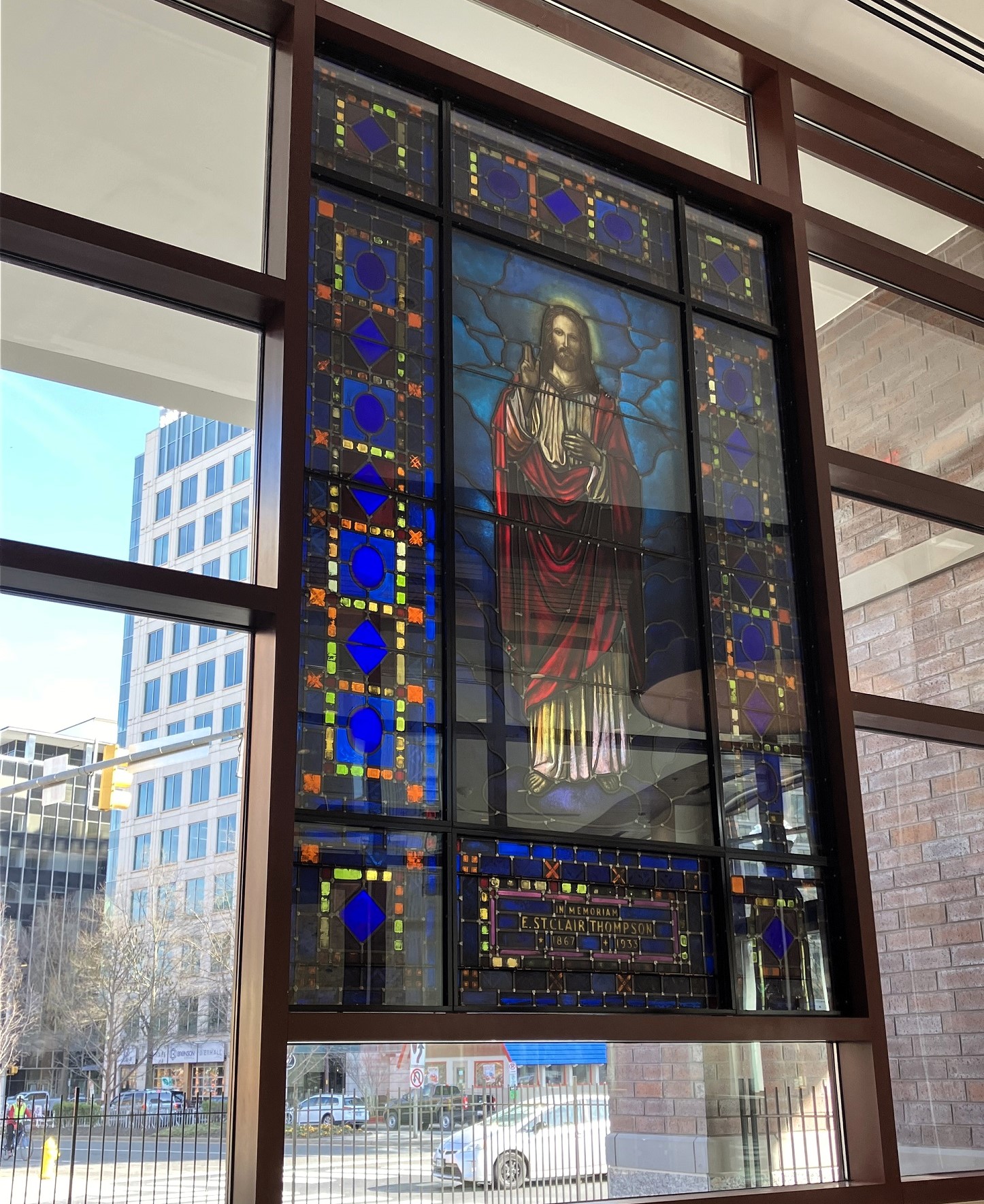 Christ in Blessing, a Louis Comfort Tiffany Studios stained glass window, is now on display in the entrance of the redeveloped Central United Methodist Church (CUMC), overlooking the protected Robert Ball Sr. Family Burial Ground.