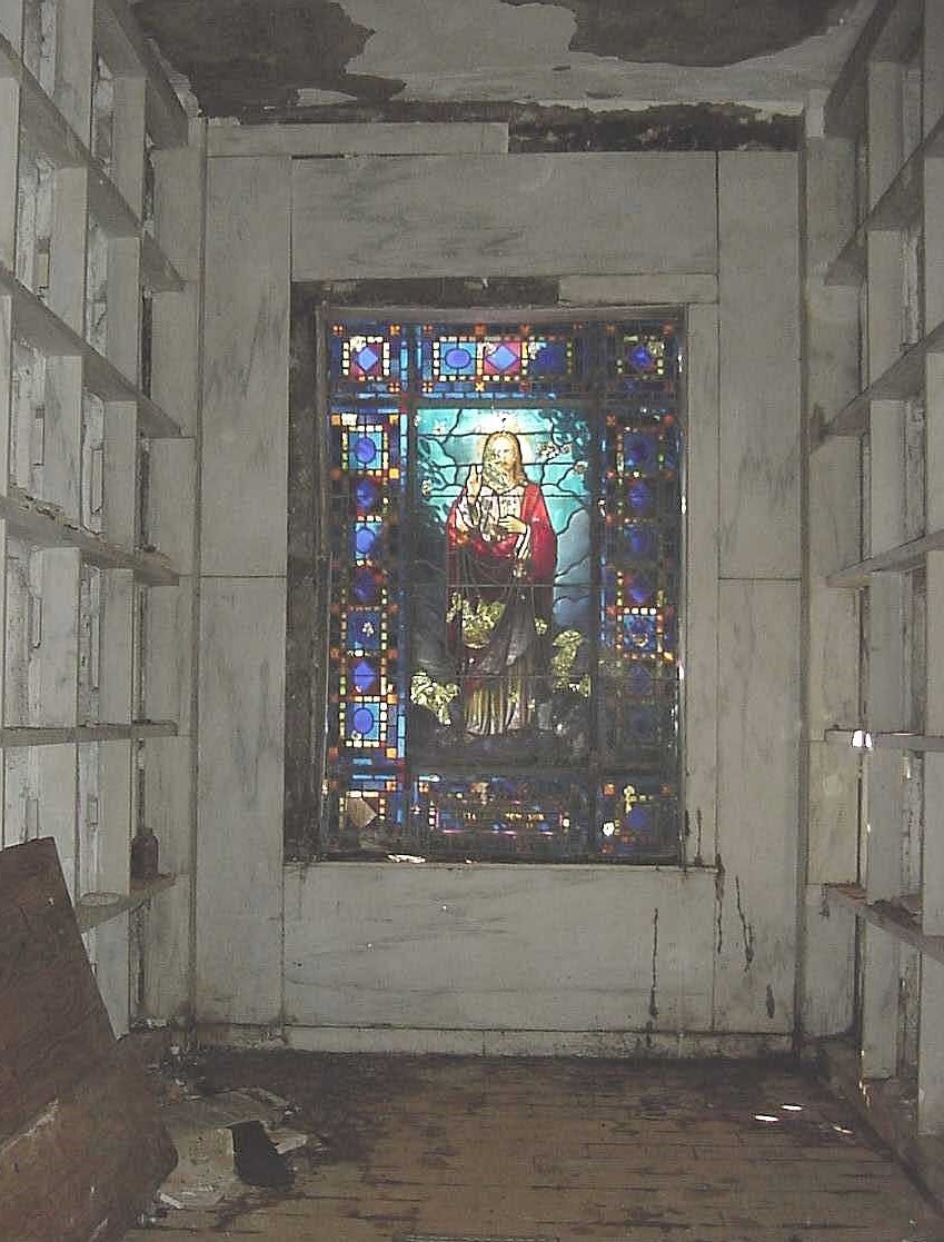 The featured and largest piece from the mausoleum’s collection, Christ in Blessing, suffered considerable damage. The 9' high by 6' wide leaded glass window, dating to ca. 1934, is comprised of twelve panels of single-layer French or German antique mouth-blown glass, matted, painted, and fired, with silver stain highlights. Approximately 35 percent of the original glass in the window was either missing or damaged.