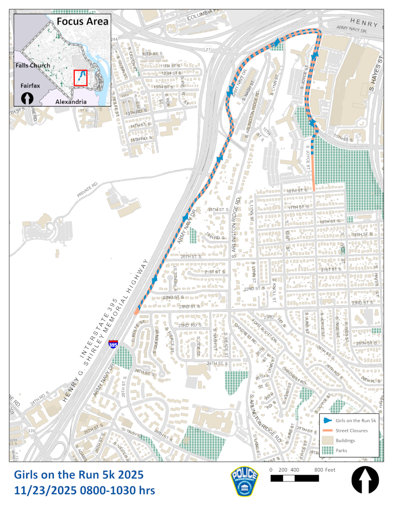 The 2025 Girls on the Run 5k Race will take place in Pentagon City on Sunday, November 23, and will begin at 8:30 a.m. The following roadways will be closed in order to accommodate the event: