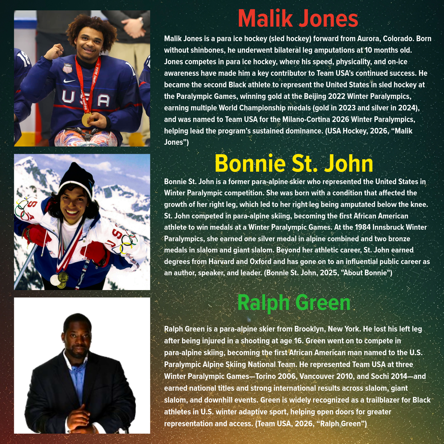 From Malik Jones, a gold-medal–winning sled hockey athlete and rising leader in para ice hockey, to Bonnie St. John, the first African American to medal at a Winter Paralympics, and Ralph Green, a trailblazer in U.S. para-alpine skiing, these athletes embody perseverance, excellence, and impact. Their stories remind us that representation matters and that barriers can and should be broken.