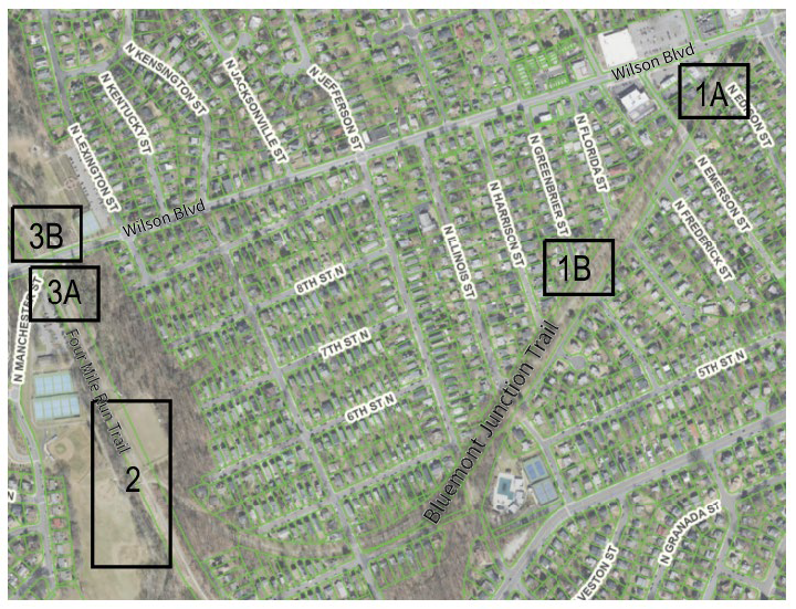 - Project Area 1A – Bluemont Junction @ N Edison Street – A new connector path to the main trail at the corner of N Edison Street.