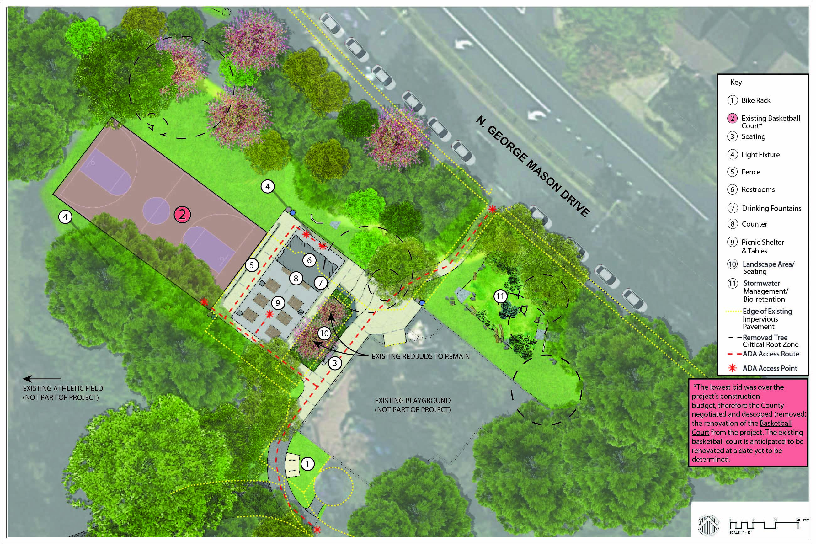 This Parks Maintenance Capital project will renovate the northern portion of Lacey Woods Park. The project scope includes the restrooms and picnic shelter, basketball court lighting, site furnishings, site circulation, ADA improvements, limited fencing, stormwater management, drainage, and landscaping. The existing playground is not included in this renovation phase. It should be noted that the original scope of the project included renovation of the basketball court surface, court fencing, and basketball hoops; however, due to construction costs coming in higher than expected these items have been deferred to a later date.